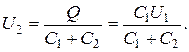 де U 2 - різниця потенціалів на затисках батареї конденсаторів. З урахуванням того, що заряд після приєднання другого конденсатора залишився таким же, виразимо різницю потенціалів U 2 у такий спосіб: