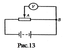 1) показання вольтметра опором RV =500Ом, з'єднаного з однією з клем потенціометра і рухливим контактом, установленим посередині потенціометра; 2) різницю потенціалів між тими ж точками потенціометра при відключенні вольтметра. Розв’язок. 1. Показання вольтметра, підключеного до точок А і В (рис. 13), визначимо за формулою