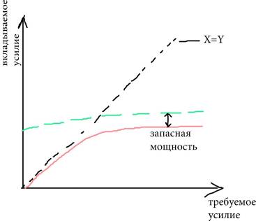 Канеман не отрицает идею селекции, а смотрит на проблему внимания с другой стороны. Это случай, когда когнитивный психолог взял идею у психоаналитиков, у которых при желании можно выделить энергетическую концепцию внимания. Если приходится выполнять несколько действий сразу, то возникает вопрос: «Как регулируется распределение усилий?» Основная идея состоит в том, что психическое усилие в принципе ограничено определенным ресурсом. Испытуемый выполняет ряд возможных действий, видов активностей, каналов восприятия и переработки информации. И для каждой деятельности необходимо усилие (определенная энергетика). Сравнивает с электроприборами в доме (э/э необходима для каждого прибора). Должен существовать блок оценки необходимой мощности. Суммарная мощность в принципе может быть различной. Если требуются дополнительные усилия, то от блока оценки идёт сообщение на центральный Активация зависит от многих факторов (возраста, эмоционального усилия и др.). В этом блоке устанавливается реальный предел, после которого располагается как раз доступная мощность, которая может являться предметом запроса. Четвертым центральным блоком в модели является политика распределения мощности. Это своего рода менеджер. И встаёт вопрос о том, что определяет данную политику. Следующие факторы: а) постоянные диспозиции – здесь по существу говорится о непроизвольном внимании. Сюда относятся яркость, интенсивность, наличие движения, собственное имя. б) текущие намерения. Здесь при выполнении той или иной задачи относятся инструкции испытуемому, специфика выполнения программы по содержанию, сложность задачи. в) оценка необходимой мощности; г) сообщение об ограниченности общего ресурса. Получена теоретическая схема, которую следует более подробно обосновать. Канеман вспоминает о законе Йеркса-Додсена где уровень мотивации может по-разному влиять на продуктивность в зависимости от сложности задачи. На графике по ОХ – требуемое для решения основной задачи усилие, а по ОУ – вкладываемое усилие. Идеальный случай, когда вкладываемое усилие равно требуемому. Но гипотеза заключается в том, что ресурс ограничен. На каком-то этапе усилий достаточно, а затем вкладываемых усилий будет не хватать. В принципе к основной задаче добавляется дополнительная. На графике есть кривая, дающая суммарное общее усилие.