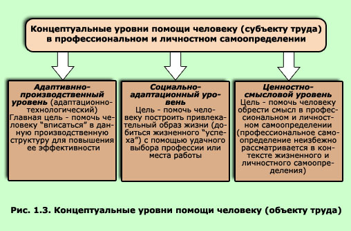 Проблема метода психологии труда связана и с проблемой неизбежной манипуляции сознанием клиента в отдельных случаях. Можно обозначить примерно следующие варианты такой неизбежной манипуляции: 1) клиент находится в состоянии аффекта и не способен самостоятельно, а значит, и ответственно принять важные жизненные решения, касающиеся его работы или карьеры; 2) клиент является социально незрелым существом и др. Таким образом, проблема метода сводится не к вопросу о том, что следовало бы вообще отказаться от манипуляции, а к тому, чтобы свести эту манипуляцию к разумному минимуму… И, вероятно, главным критерием допустимости (или недопустимости) даже частичной манипуляции является сохранение личностного достоинства тех людей, с которыми работает психолог труда, а также - сохранение достоинства самого психолога. В соответствии с представленным выше пониманием предмета и метода психологии труда можно условно выделить различные концептуальные уровни помощи человеку (развивающемуся субъекту труда) в профессиональном и личностном самоопределении.