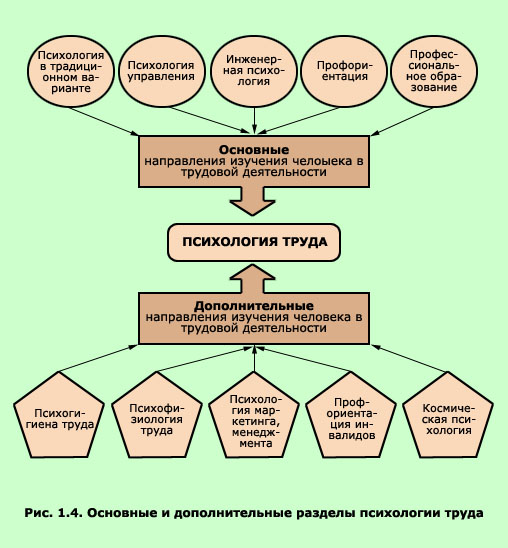 - Условно можно выделить следующие основные направления (разделы) изучения человека в трудовой деятельности (см. рис. 1.4):