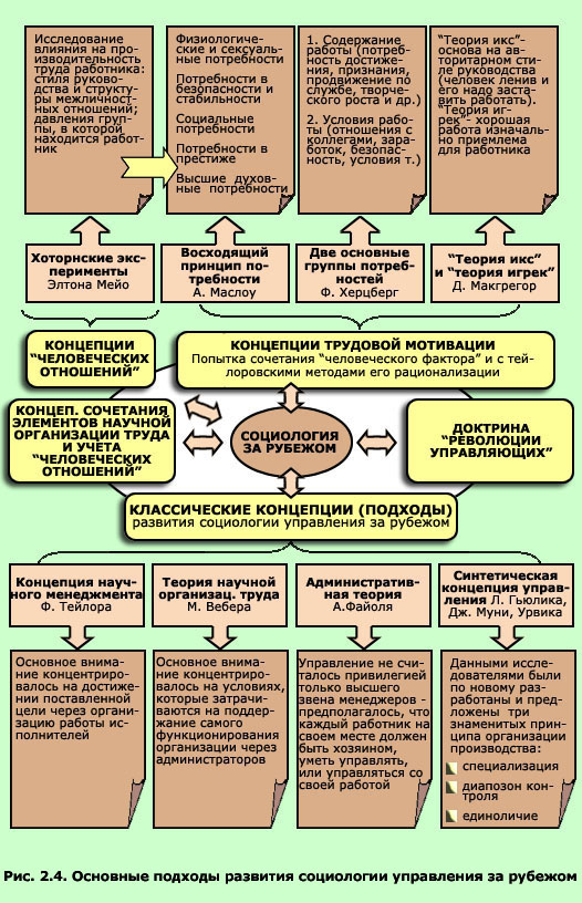 В целом можно выделить следующие основные этапы развития социологии управления за рубежом. Выделяют две основные школы, которые, возникнув раньше других, стали непосредственными предшественницами новейших теорий управления: 1) "классические подходы" и 2) концепции "человеческих отношений".