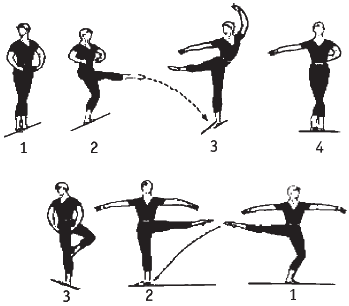 Руки при выполнении battement developpe поднимаются в I-ю позицию. Во время pas degage правая рука отводится во II-ю позицию, левая – в III-ю; во время возвращения левой ноги в V-ю позицию правая рука остается во II-й позиции, левая опускается в I-ю. Поворот головы сопровождает движение рук. Battement developpe правой в сторону в demi-plie на левой. Затем pas degage с широким поступательным движением в сторону на всю ступню через вытянутые пальцы, и фиксации положения ноги на 90°. Левая нога сгибается в положение «у колена» с поворотом направо. После этого все упражнение выполняется с другой ноги. Данное упражнение выполняется назад по той же схеме. Изучается temps lie на 90° медленно, на два музыкальных такта в 4/ 4: 1/4 – сгибание ноги в положение «у колена», 1/4 – battement developpe, 1/4 – pas degage, 1/4 – фиксация позы. Затем: 1/4 – опускание левой ноги в V-ю позицию и сгибание правой в положение «у колена», 1/4 – battement developpe, 1/4 – pas degage, 1/4 – фиксация позы и т. д. Когда temps lie на 90° будет хорошо усвоено в медленном темпе, можно приступить к выполнению в более быстром темпе. При изучении temps lie на 90° необходимо добиваться предельной слитности, точности и апломба движения, что воспитывает у занимающихся чувство пластичности и законченности формы, которая затем будет необходима в более сложных и трудных формах движения. В этом заключается назначение и ценность данного учебного материала. В дальнейшем в группах СС и ВСМ temps lie на 90° выполнять на полупальцах. В этом случае все, кроме demi-plie и battement developpe, выполняется на высоких полупальцах. РЕКОМЕНДУЕМЫЕ ХОРЕОГРАФИЧЕСКИЕ ДВИЖЕНИЯ ДЛЯ УЧЕБНО-ТРЕНИРОВОЧНОЙ ГРУППЫ ЧЕТВЕРТОГО ГОДА ОБУЧЕНИЯ Date: 2015-09-22; view: 557; Нарушение авторских прав |