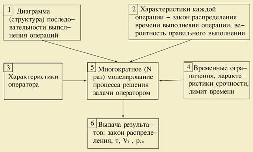 На первом этапе моделирования проводится формализованное описание деятельности оператора. При этом важно учесть некоторые психофизиологические особенности деятельности: возникновение напряженности в работе, совершение ошибочных действий и их исправление, взаимодействие операторов во время работы, динамику работоспособности оператора, влияние очереди и т. д. После этого строится математическая модель, т.е. деятельность оператора описывается с помощью математических объектов (формул, уравнений, неравенств). Для моделирования на ЭВМ модель преобразуется в моделирующий алгоритм, на основании которого составляется программа моделирования. В результате моделирования вычисляются многие характеристики деятельности оператора: степень загрузки, периоды занятости, своевременность решения задач и др. Зная их, можно определить допустимую плотность (темп поступления) задач, произвести оценку загрузки оператора, выявить характер и частоту появления различных ситуаций в системе "человек - машина".
