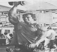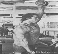 Цель упражнения: Развитие передней головки дельтовидной мышцы. Это упражнение также разрабатывает трапециевидные мышцы в верхней трети движения. Его можно выполнять сидя или стоя. Выполнение: Встаньте, опустив руки с гантелями вдоль туловища. (1) Поднимите одну гантель вверх и вперед по широкой дуге выше головы. (2) Плавно опустите гантель, полностью контролируя движение, и одновременно поднимите другую гантель, чтобы обе руки находились в движении и гантели разошлись в противоположных направлениях перед лицом. Для непосредственного воздействия на переднюю головку дельтовидной мышцы следите за тем, чтобы гантели проходили прямо перед лицом, а не сбоку. Выполняя такое же движение со штангой, возьмитесь за гриф верхним хватом. Поднимите штангу на вытянутых руках и поднимите ее чуть выше головы; затем вернитесь в исходное положение. Вариант: Выполняйте фронтальные подъемы в положении сидя, чтобы движение было более четким. Таким образом вы сможете избежать "читтинга".