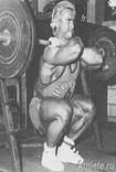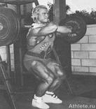 Цель упражнения: Разработка мышц ног, с особым акцентом на мышцах бедра. Приседания с перекрестным хватом помогают развить внешнюю линию квадрицепсов. Выполнение: (1) Подойдите к стойке, заведите плечи под гриф штанги. Затем, удерживая локти в поднятом положении, скрестите руки перед собой, возьмитесь за гриф и снимите штангу со стойки. Отступите в сторону и слегка расставьте ноги для равновесия. Мне легче выполнять это упражнение, если я стою на низком блоке. (2) Согните ноги в коленях, удерживая голову поднятой, и приседайте с прямой спиной, пока ваши бедра не опустятся ниже линии, параллельной полу. Затем вернитесь в исходное положение. Это упражнение нужно выполнять медленно и со строгой техникой, не забывая держать спину прямой. По возможности выполняйте любые приседы со штангой перед зеркалом, чтобы следить за положением спины.