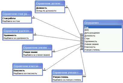 Справочники стажа работы, сложности и классности сформированы аналогичным образом. 3. Установка связи между таблицами Механизм описания логических связей между таблицами в Access реализован в виде объекта, называемого схемой данных. Перейти к ее созданию можно из панели инструментов База данных, доступной из главного окна. Альтернативный вариант вызова данного режима доступен через меню Сервис, Схема данных. Интерфейс задания связей между полями в схеме основан на «перетаскивании» (перемещении при нажатой левой кнопки мыши) выбранного поля и «наложении» его на то поле, с которым должна быть установлена связь. Для связывания сразу нескольких полей их следует перемещать при нажатой клавише <Ctrl>. Выделяют несколько типов связей между таблицами в схеме: · один к одному (1:1) – одному значению поля в одной таблице соответствует только одно значение поля в другой; · один ко многим (1: ∞) – одному значению поля в одной таблице соответствует несколько (одно или более) значений в другой. С помощью мастера схемы данных в схему БД были добавлены новые таблицы, которые должны иметь связь 1: ∞. Связывание таблиц производилось «перетаскиванием» мышью соответствующих полей на поля с таким же типом данных другой таблицы: поле «Должность» из базовой таблицы связывалось с полем «Должность» из справочника и т.д. В результате связывания необходимых полей таблиц схема данных имеет вид (рис. 3.1).