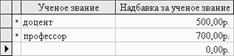 В главную таблицу «Сотрудники» были «вручную» введены только данные по ФИО и дате рождения – остальные данные выбирались при помощи выпадающих списков (подстановок) в полях главной таблицы. Выпадающие списки в определенном поле каждой из строк главной таблицы содержат данные из соответствующих таблиц-справочников, что определено созданными связями между таблицами. 5. Создание запроса на выборку и отчета При создании запроса в режиме конструктора в основное окно были добавлены все необходимые таблицы, данные из которых необходимо включить в таблицу-запрос: ФИО (из таблицы «Сотрудники»), Оклад по должности (из справочника «Должность»), Надбавка за классность (из справочника «Классность»), Надбавка за ученое звание (из справочника «Ученое звание»), Надбавка за ученую степень (из справочника «Ученая степень»), Надбавка за стаж (из справочника «Стаж работы»), Надбавка за удаленность (из справочника «Удаленность»). В последнем столбце должна содержаться формула Сумма: [Оклад по должности]+[Надбавка за классность]+ +[Надбавка за стаж]+…, которая возвращает сумму начислений по каждой текущей записи. В этом же столбце в строке «Сортировка:» должен быть выбран тип – «по возрастанию». Таким образом, выполнение приведенных выше действий дает возможность получить таблицу-запрос (табл. 5.1). Таблица 5.1