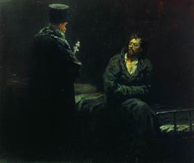 Отражая в своих картинах существенные стороны современности, Репин не мог пройти мимо той борьбы, которую вели с самодержавием в эпоху 70-х годов революционеры-народники. Одним из первых в русском искусстве он обратился к созданию образов мужественных и стойких борцов за народное дело, утверждая новые нормы поведения человека, новый этический идеал. И если в своих монументальных полотнах с изображением народа («Бурлаки», «Крестный ход») Репин выступал прежде всего как мастер остросоциальных характеристик, то в картинах на революционную тему («Арест пропагандиста» в двух вариантах – 1878 и 1880–1892 гг.; «Отказ от исповеди», 1879–1885; «Не ждал», 1884) он показал себя тонким психологом, художником широких творческих возможностей, которому доступны как многоплановые эпические сюжеты, так и напряженные драматические конфликты. «Отказ от исповед»». Сюжет картины был взят художником из самой жизни. У верных слуг царизма – тюремщиков – было много всяких способов воздействия на заключенных, чтобы пошатнуть их волю, поглумиться над ними. Из них, пожалуй, самым издевательским и лицемерным был обычай исповеди осужденных на казнь. За несколько часов до свершения казни к обреченному на смерть приходил священник, чтобы в процессе исповеди выведать у него все необходимое. То, чего не могли сделать следователь и судья, должен был сделать священник. Что мы видим на картине? В мрачной холодной камере, на железной тюремной кровати, сидит человек, приговоренный к смертной казни. На его измученном длительным заключением лице выражена решимость вынести все страдания до конца. С презрением и гневом встречает он пришедшего к нему священника, обнаруживая в отказе от исповеди верность своим убеждениям, непреклонность своего характера, силу воли. Гордо поднятая голова осужденного, открытая грудь и вся его взятая в энергичном повороте фигура освещены скупым серебристым светом, который, пронизывая полумрак камеры, выхватывает из темноты зловеще поблескивающий крест. Революционеру противостоит темная и мрачная фигура священника, намеренно изображенная художником со спины. Репина не интересует ни мир его чувств, ни его личные качества. Для художника он лишь живое олицетворение всех тех сил реакции, с которыми боролся и продолжает вести борьбу не сломленный духом герой. В этом столкновении двух людей наглядно раскрывается идея произведения, звучит утверждение справедливости революционной борьбы и уверенность в ее конечной победе.