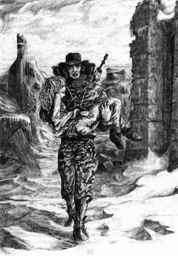 Хотя Карлайл всегда был покрыт плотным белым одеялом, снегопад сильно изменил картину. Теперь город казался не таким уж суровым и пустынным. Юэн почти не удивился бы, вновь услышав на улицах забытый гул и шум цивилизации. Свежий снег мягко ложился на плотный обледеневший наст, коварно скрывая рытвины и препятствия. Чтобы не поломать ноги, двигаться нужно было очень осторожно. Снег уже не падал отвесной стеной, как ночью: огромные хлопья планировали плавно и неспешно. Ложась на одежду, они постепенно покрывали ее ровным слоем, похожим на белую плесень. У стены Собора Юэн выдернул из кучи дров палку подходящей длины — как раз до пояса. Прощупывая снег перед собой, он пошел на юг — туда, где ночью звучали выстрелы. Его путь лежал мимо обожженных и разломанных стен, с которых осыпалась краска, оставляя на свежем снегу красные пятна, словно от крови. Справа виднелись очертания большого каменного здания, укрепленного стальными и деревянными листами. Кажется, обитатели Собора использовали его как склад. Слева раскорячился четырехэтажный кирпичный дом без крыши, обугленный словно самим адским пламенем. Город представлял собой странную смесь развалин и убогих укреплений, в которых несчастные перепуганные люди пытались сдерживать натиск нового мира. Прямо перед Юэном, вперившись в него слепыми окнами, возвышалось над снежными просторами здание, когда-то бывшее белым, а теперь приобретшее неразличимый грязный цвет. В этом милом городишке, как и в этом милом мире вообще, места для чистого белого цвета больше не осталось. Такая жизнь. Миновав небелое здание, Юэн уткнулся в груду битых кирпичей — судя по всему, бывший магазин. Из снега торчал кусок поблекшей зеленой вывески. Зазеваешься, попадет нога между кирпичей, и все. Пока будешь баюкать вывихнутую лодыжку, придет кто-нибудь удивительный, да и откусит тебе ее на хрен. А может, и голову. Юэну показалось, что он разглядел следы тропинки между развалин. Тыча палкой в снег, он начал пробираться через руины, стараясь держаться этой путеводной нити. Вокруг тянулись к небу металлические ребра обрушенного здания. От инея они стали серебристо-белыми, и на мгновение Юэну почудилось, будто он бредет сквозь огромный скелет какого-то сказочного зверя. Внезапно кирпич выскользнул из-под его ноги, и Юэн с трудом удержал равновесие, зато голова его мгновенно очистилась от детских фантазий. Снег и тишина играли с ним опасные шутки. Юэн заставил себя собраться. Он осторожно спустился с развалин на улицу, остановился, чтобы поправить на плечах рюкзак и автомат, и двинулся дальше. Вдоль узкой улицы стояли покалеченные дома, пострадавшие не от ядерного удара, а от времени и неумело разведенных костров. Юэн шел медленно и осторожно, приглядываясь к каждому дверному проему, каждой витрине с полузакрытыми ставнями. Казалось, что во тьме оконных проемов таится кто-то, изучающе оглядывает чужака, оставаясь невидимым. В этой жутковатой тишине Юэну было не по себе. Нервы, измотанные дурными снами, разыгрались не на шутку. Он снял с плеча автомат и проверил магазин и предохранитель. Это его немного успокоило, но тишина продолжала стискивать объятия. Даже шуршание, с которым снег ложился на поверхность, было отчетливо слышно и заставляло нервно озираться по сторонам. Пройдя до конца ряд грязных развалин, Юэн поражен