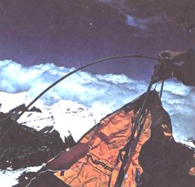 Моя палатка, которую я ставил вечером и снимал утром, имела самонесущую конструкцию. Она натягивалась на пересекающиеся алюминиевые штанги, образующие полусферу. Это палатка моей конструкции, сделанная специально для этого одиночного восхождения.